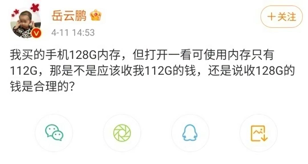 近日,德云社的知名相声演员岳云鹏发布了一则微博。在微博中,他表示自己购买了某品牌标注128GB存储空间的手机,然而实际打开之后发现可用存储空间只有112GB。为此,岳云鹏向网友发问,“如果可用存储空间只有112GB,是不是应该只收112GB的钱,还是说收128GB的钱就是合理的?”