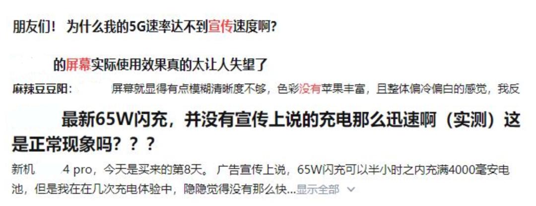 为什么新买的手机,在充电时并没有宣传所说的那么快?新买的5G手机,网速为什么达不到宣传页面所说的4G网速的10倍?为什么明明宣传说散热系统降温10°C,手机的边框还是烫的?为什么手机的屏幕尺寸感觉并没有宣传页面说的那么大?说好的8GB运存,开机怎么就剩4.5GB?种种疑问的发生,充分暴露出手机厂商在宣传方面的不自信以及在市场教育方面的不足。