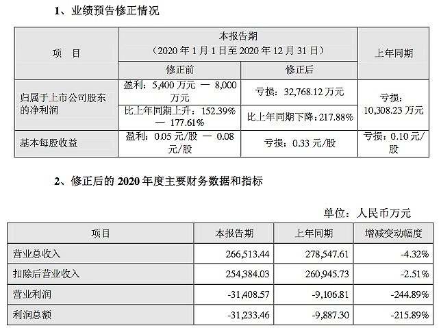 4月12日晚间,贝因美发布公告,修正2020年度业绩预告,公司原预计净利润为盈利5400万元至8000万元,修正后为亏损3.28亿元,公司上年同期亏损1.03亿元。同时,修正后的营业收入、扣非净利润均出现不同程度的下滑。