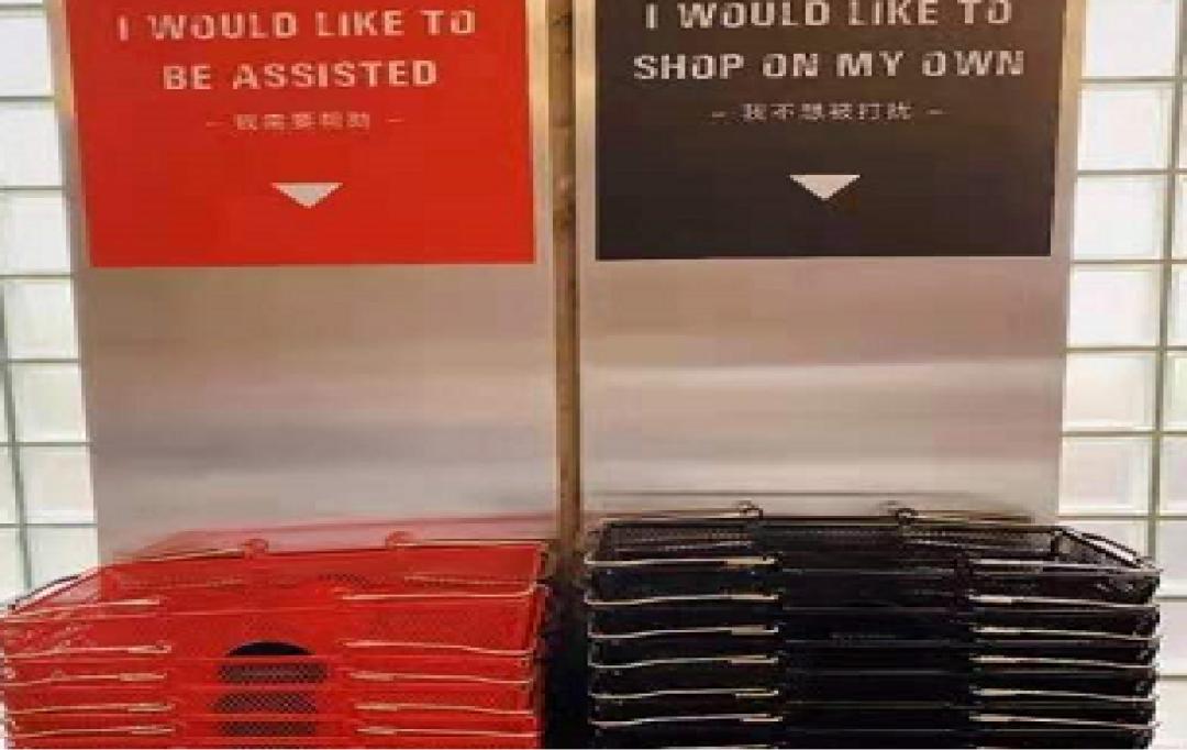 一进店,就会有店员友情提醒,如果你需要导购帮助,就可以拿红色的篮子;如果你希望单独逛逛,就可以选择黑色的篮子,这个黑篮子就类似海底捞那种“请勿打扰”的牌子。