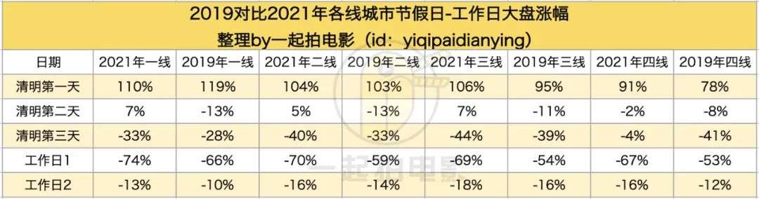 我们总结整理了2019年对比2021年的清明档以及清明档过后的两天工作日大盘对比,可以清晰的发现一些规律。