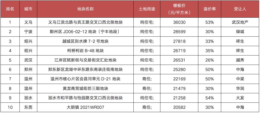 在优质宅地的入市的影响下,3月份,三四线城市更是诞生了多个板块、区域乃至全市的“单价地王”,如义乌、绍兴、丽水均有全市“单价地王”诞生。其中,3月成交单价最高的地块为义乌原宾王客运站地块,成交楼板价为36030元/平方米,一举刷新了义乌成交涉宅用地单价天花板。