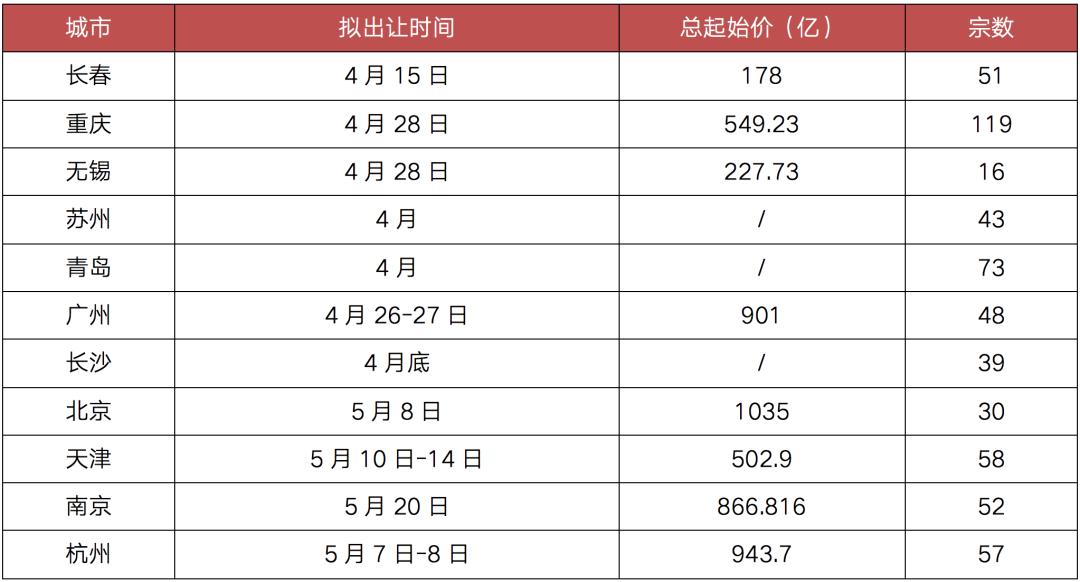 据不完全梳理,截至目前已有约 17 个城市明确首批集中出让土地的日程表,北京、杭州、重庆等 11 个城市明确将在 4-5 月集中供应土地,其中,广州、长春、无锡和重庆四个城市则明确在 4 月底集中拍地。