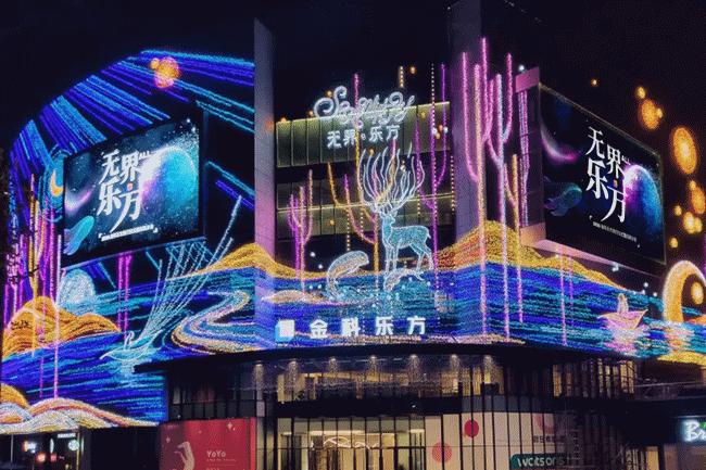 重庆金科乐方外立面采用独特的梦幻主题灯画设计,以麋鹿、茶花为元素,利用上万组灯饰打造出极具绚烂欢乐空间感的视觉效果,室外街区增设网红休息区、网红楼梯等多个特色空间场景,打造成为重庆个性有趣的拍照打卡点。