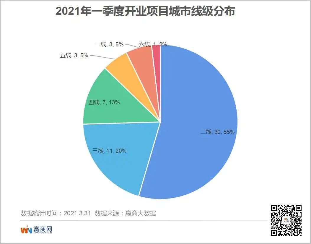 在城市线级分布上,低线城市活跃度明显高于高线级城市。其中,二线城市依然是第一大市场,项目占比高达55%,分布于18座城市,而重庆、长沙是开业项目最多的城市;三线城市占比20%,四线城市占13%。