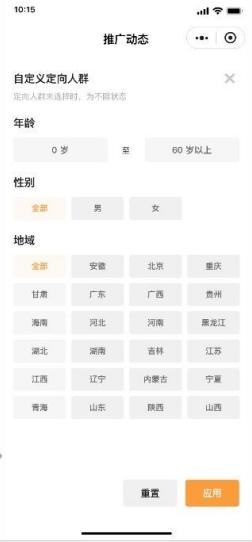 创建视频推广动态时,可选择智能匹配人群,也可以自定义定向人群。目前暂时只支持年龄、性别、地域维度的定向。