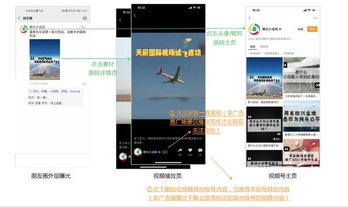 在最终的推广广告上,用户在点击视频之后直接跳转详情页。详情页中的关注按钮会全程展示,(在普通观看场景,关注按钮要在播放1分钟后出现)。另一个优势则是用户上下滑动只出现投放账号的视频,不会推荐其他账号的视频。
