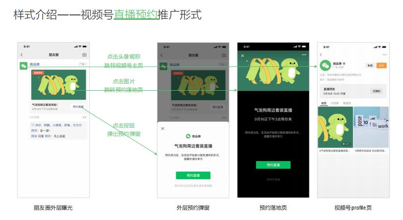 推广当前直播时,用户点击即可跳转直播间。如果推的是“预约直播”,用户点击不同的组件,会出现弹窗或介绍的落地页,进而点击预约。