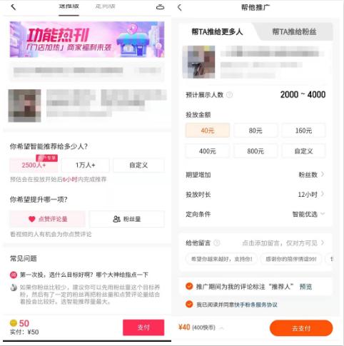 从推荐用户看,三者都提供了系统智能推荐、自定义定向推荐两方面。在这基础上,dou+和粉条还有达人相似粉丝推荐选项。