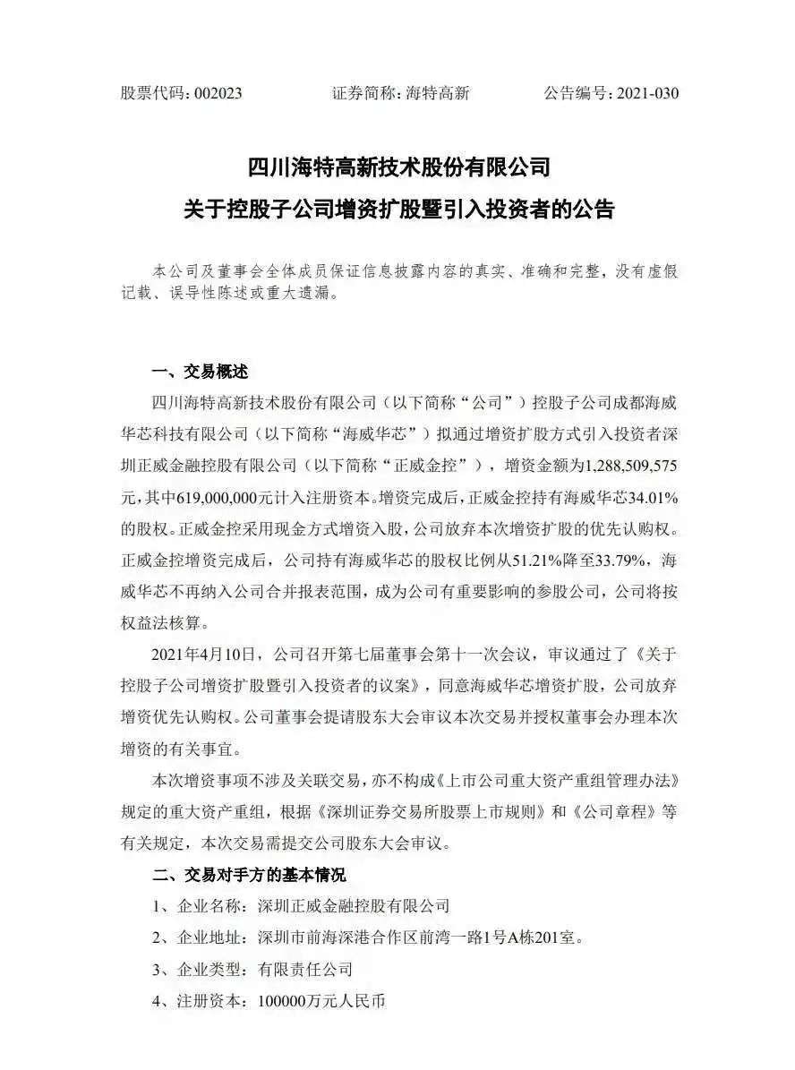 4月12日晚间海特高新发布公告,公司控股子公司海威华芯拟通过增资扩股方式引入投资者正威金控,增资金额为12.89亿元。海威华芯以投前估值25亿元进行本轮增资。增资完成后,正威金控持有海威华芯34.01%的股权,公司持有海威华芯的股权比例从51.21%降至33.79%,海威华芯不再纳入公司合并报表范围,成为公司有重要影响的参股公司。