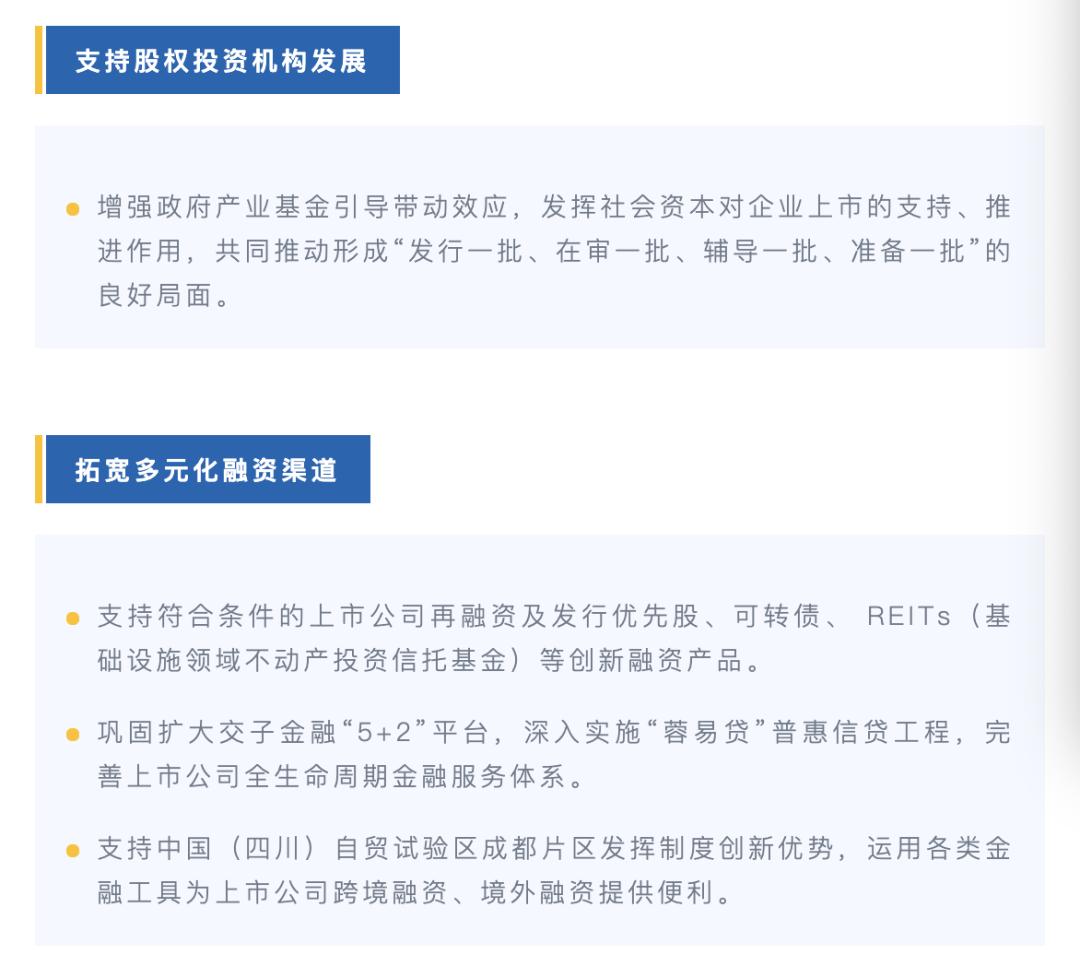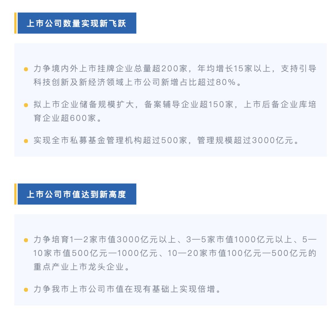 《意见》围绕支持优质企业上市、支持上市公司做强做优做大、提高上市公司治理水平、防范处置上市公司风险、营造地方良好资本市场生态等内容,提出了多项举措。此外,《意见》的主要目标为力争在“十四五”期间,成都上市公司数量持续保持中西部第一,在全国副省级城市中名列前茅。