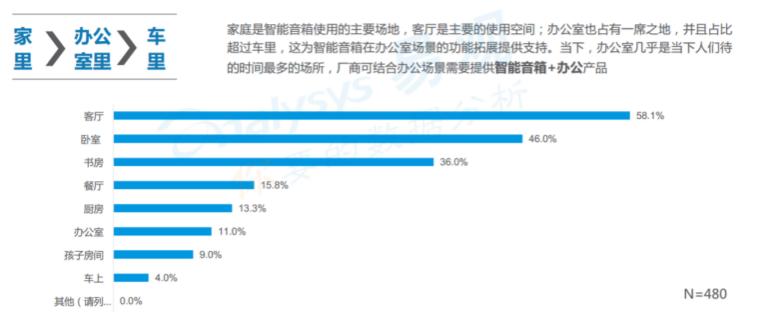 目前,智能音箱使用场景占比排在前三位的分别是客厅、卧室、书房,办公室和车内的使用占比都相对较低,其他特殊场景更不用说。