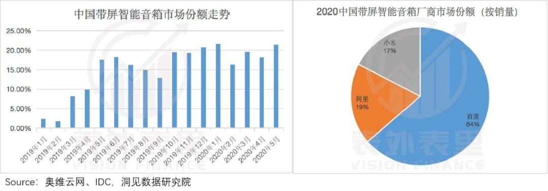 如下图,2019年1月-2020年5月,带屏音箱的市场份额从2.4%提升到了21.4%,逐渐成为消费主流。其中,百度带屏智能音箱的市占率超过一半,接近阿里和小米市占率总和的两倍。