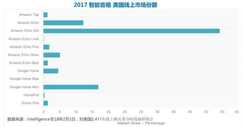 低价策略促使EchoDot占据美国2017年线上智能音箱份额的第一位。