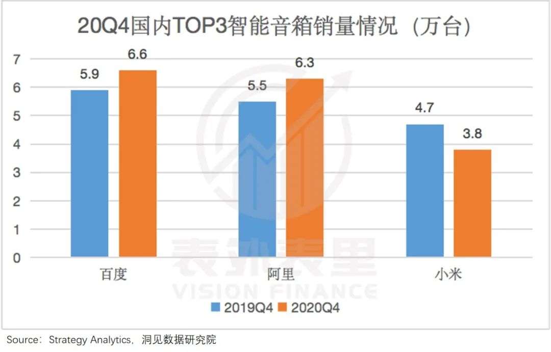 从2020Q4国内TOP3的智能音箱出货和增长情况来看,小度和天猫精灵增长态势良好。