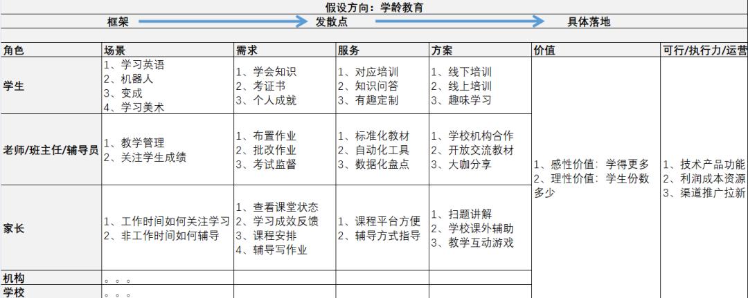 我心里非常没底,因为我几乎从未接触过这条新业务——学龄在线教育,临时抱佛脚做了一番竞品分析、市场调研、行业了解,大致有了知识储备,我梳理了一套落地模式。