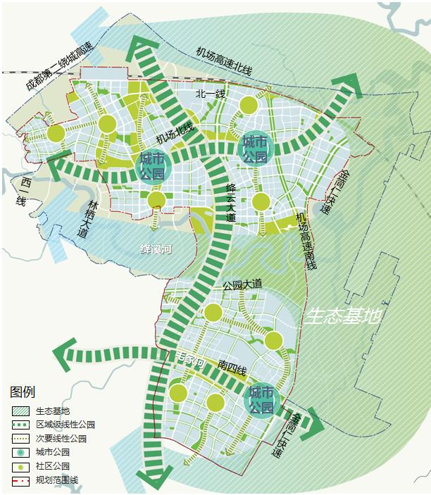 作为一座面向未来的产业新城,成都未来科技城在规划时充分依托现有自然地理条件科学布局,结合“西高东低,南高北低”的地形地貌,依托绛溪河、大安溪、泉水河等绿谷低地,构建生态骨架,基于河流走向自然分割,形成了“两轴三片”的空间布局。