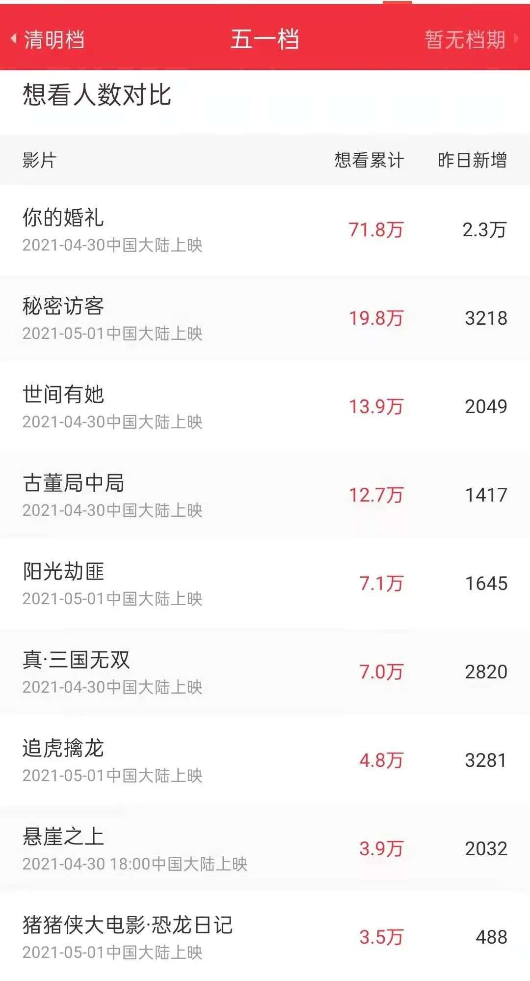 根据猫眼专业版数据,截至毒眸发稿日,居于观众想看数量榜单前三位的分别为累计71.8万的《你的婚礼》、19.8万的《秘密访客》和13.9万的《世间有她》。