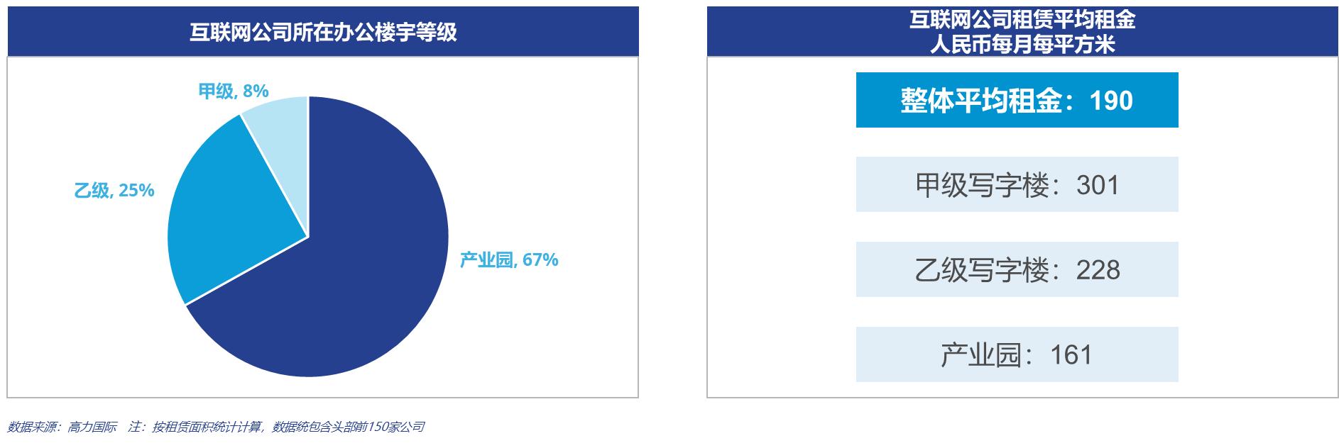 在租金方面,互联网科技公司目前平均租金水平相对较低,平均租金约190元每月每平米,低于整体办公市场223元每月每平米的水平。此外,当前互联网公司依旧维持了迅猛的扩张速度。