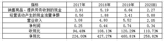 2017-2020年上半年,公司经营活动产生的现金流量净额分别为0.56亿元、1.88亿元、3.41亿元和1.88亿元,同期净利润为0.25亿元、0.44亿元、0.74亿元和0.34亿元,盈利现金比分别为224%、427.27%、460.81%和258.82%,始终保持在较高水平,说明企业创造利润的能力较强,净利润的“含金量”高。