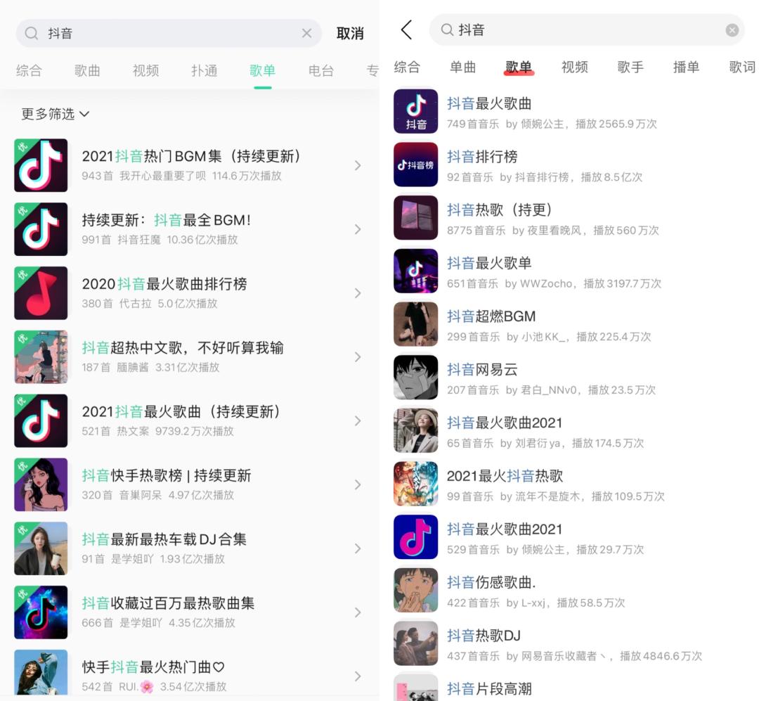 在QQ音乐与网易云音乐以“抖音”为关键词搜索歌单的时候,发现两个平台播放量最高的歌单都已经超过了8.5亿次,表面看起来热热闹闹,但打开评论区,高赞留言却是: