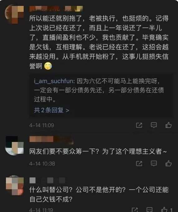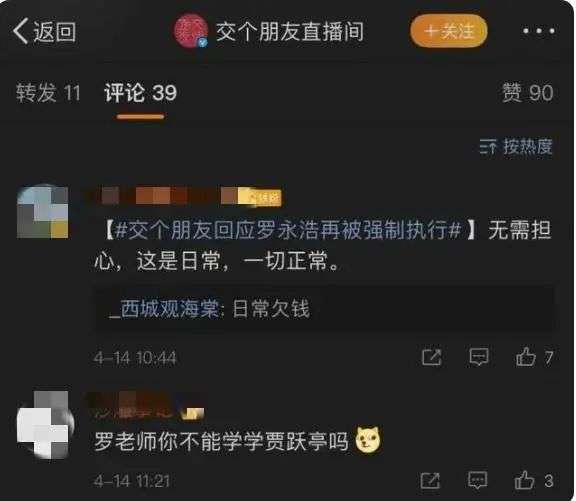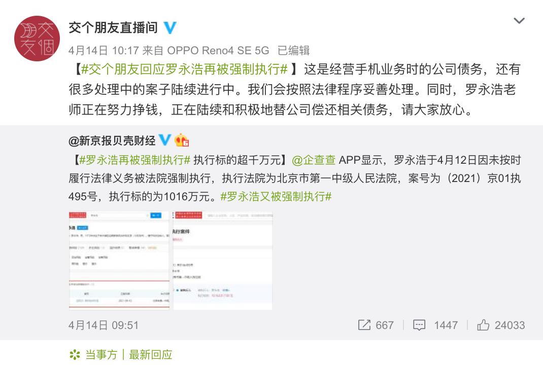 4月14日上午,@交个朋友直播间回应,这是经营手机业务时的公司债务,还有很多处理中的案子陆续进行中。我们会按照法律程序妥善处理。同时,罗永浩老师正在努力挣钱,正在陆续和积极地替公司偿还相关债务,请大家放心。