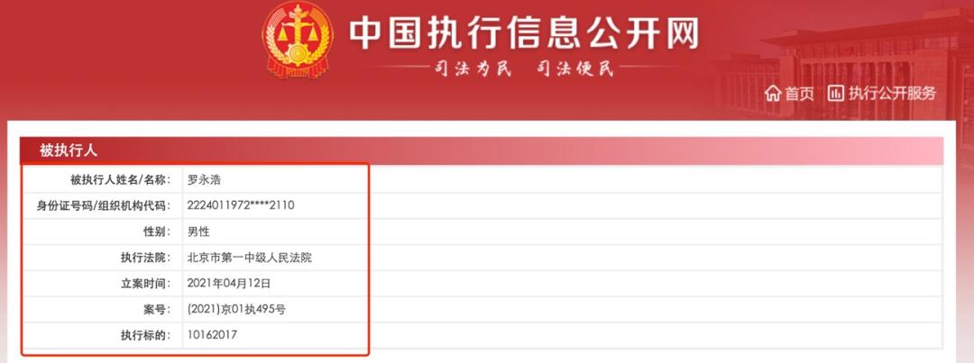 从中国执行信息公开网获悉,罗永浩于4月12日因未按时履行法律义务被法院强制执行,执行法院为北京市第一中级人民法院,案号为(2021)京01执495号,执行标的为1016万元。