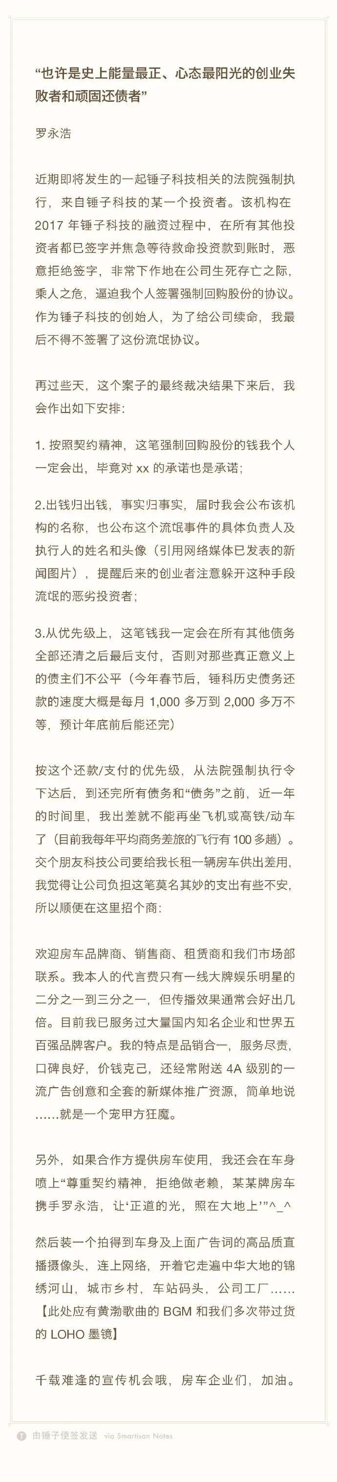 值得注意的是,今日凌晨,@罗永浩自我调侃“每次坐飞机都像是最后一次”。所以,在这篇回应中,罗永浩也顺便进行了房车招商:若合作方提供房车使用,会在车身喷上“尊重契约精神,拒绝做老赖,某某牌房车携手罗永浩,让'正道的光,照在大地上'”。