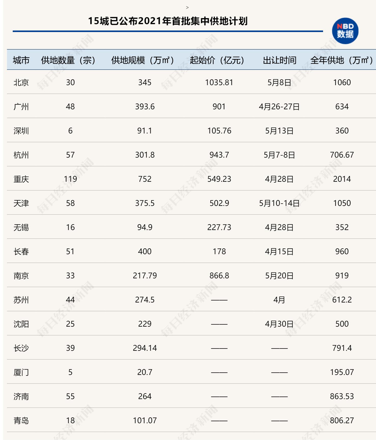 据《每日经济新闻》记者统计,目前已有包括北京、广州、深圳、杭州在内的15个城市公布了今年的首批土地集中供应计划,总计供地规模达4155万平方米。其中北京、杭州、广州、南京的首批供地的起始总价均超过800亿元。从各城首批集中供地的出让时间看,主要集中在4月中下旬到5月上中旬的一个多月时间。