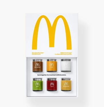 比如麦当劳为了庆祝牛肉堡上市50周年,推出了系列周边产品,其中香薰蜡烛套装引发热议,面包、番茄酱、酸黄瓜、奶酪、洋葱、牛肉六种奇特味道的蜡烛同时点燃就能召唤牛肉堡的味道,网友们吐槽这是什么奇葩操作,奈何金拱门的粉丝太多,上架被秒空。
