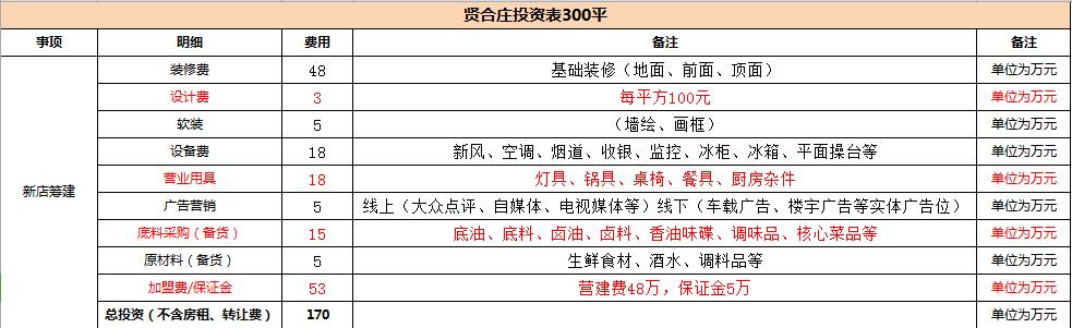 该招商经理透露称,以一家300平方米的门店为例,即使不算房租和转让费,加盟方前期需要准备170万元左右的投入资金。