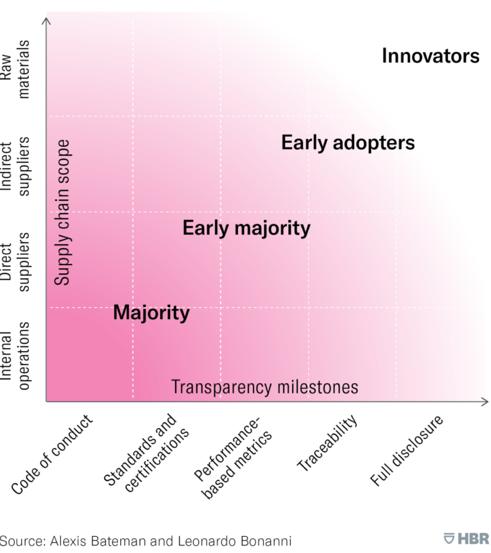 于是麻省理工学院运输与物流中心学者 Alexis Bateman 和倡议供应链透明平台 Sourcemap 合作,基于传播学者 Everett Rogers 1962 年提出的「创新扩散理论」——接受新观念、新事物、新产品的人们可以分为「创新者」「早期采用者」「早期跟随者」「后期跟随者」「滞后者」,拟定了「供应链透明化」的四个进程。