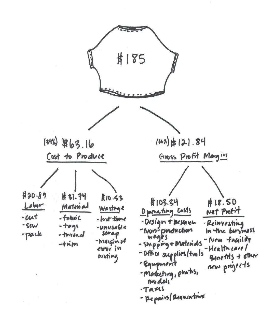 面料费:35.64 美元;制作费:18.36 美元:税费:5.4 美元;运输费:5.5 美元;成本共65 美元。