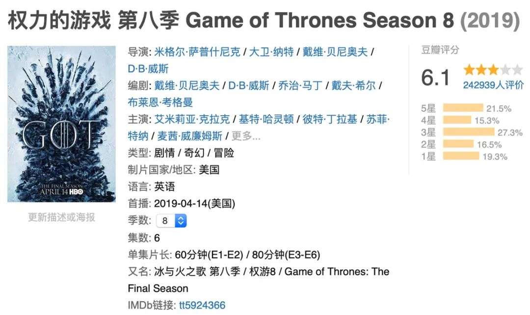 得益于乔治·R·R·马丁创作的《冰与火之歌》系列小说,“谁像主角谁就要死”、“谁人气高谁就要被捅”的故事设定,让《权利的游戏》一度引发了相当多的话题,并成为该电视剧系列最大的卖点。可好景不长,由于后来电视剧的故事进度已经超越原版小说内容,《权利的游戏》不得不从第六季开始融入部分原创情节。而电视剧版编剧对原版小说创作手法的拙劣模仿,直接导致该电视剧的口碑一路走低,并在2019年第八季的上映时,迎来堪称“史诗级失望”的大结局,给无数粉丝和观众带来了极大的伤害。
