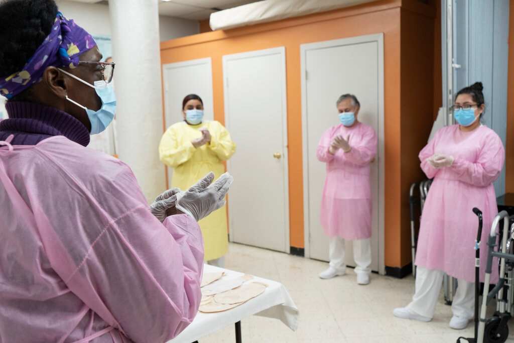 疫情期间,美国纽约市皇后区的一个家庭护理健康助理培训项目。摄影 James Estrin | 图片来源《纽约时报》