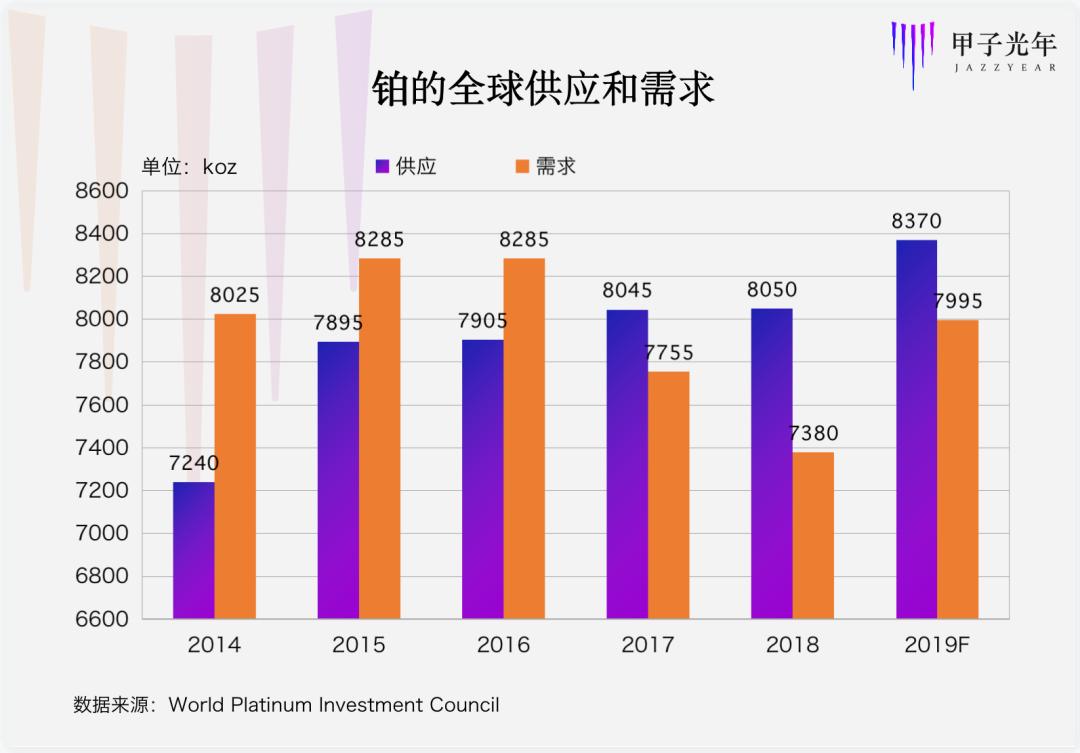 从目前看,铂有充分的供应。从2014年到2019年,铂的供应端复合年增长率为2.9%,而需求端则处于下降趋势。也不排除氢燃料电池发展会带动铂需求量持续攀升,导致铂的供应也要面临不确定性。