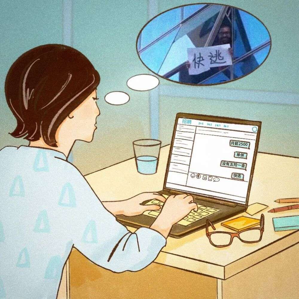 之前上网冲浪有看过一个表情包,一个男人举着一张纸,上面写着“快逃”两个字,当时我觉得挺有意思的,没想到这次竟然派上用场了。我把自己的头像改成这张图,告诉来应聘的人快逃,千万别来。