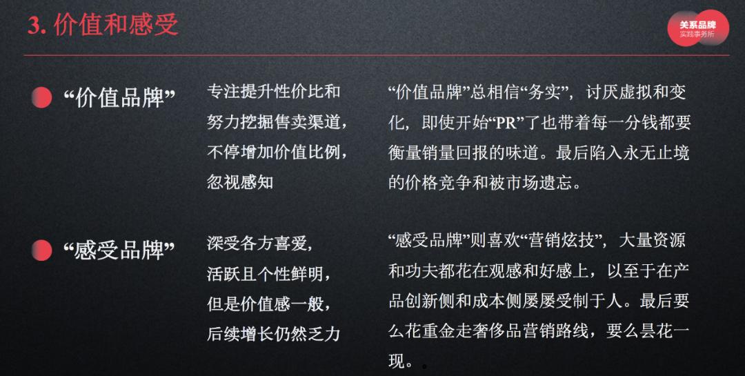 对于品牌来讲也是一样,价值包含了它的实用价值、商业价值、服务价值、愉悦价值,甚至包括价格;感受包含一个品牌呈现出的形象、观念、感觉、状态、宜人性等等。