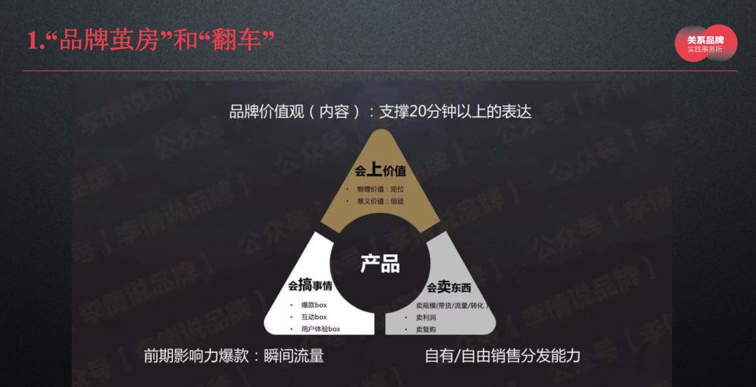最上面的角叫做“会上价值”,就是一个品牌要能上价值;左边的角叫“会搞事情”,是指有瞬间爆款、互动和用户体验的能力;右边这个角叫做“会卖东西”,光有那两个角不行,最后还得能卖东西。