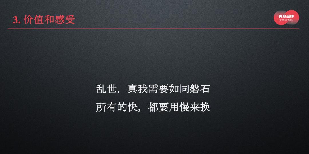 如果这个地方卡住了,讲不到20分钟,那就是价值没有弄上去,还没找到自己品牌的核心价值。中国的很多消费品企业往往会拿一句话糊弄,比如为了美好生活、做更好的东西等等,但我觉得这个都还不算。
