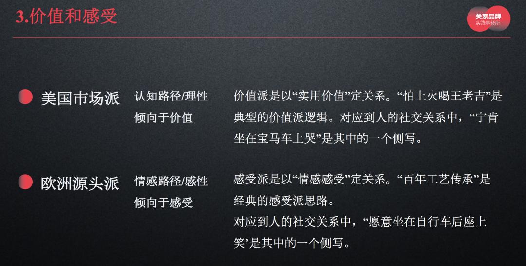 我把美国的营销理论定义为市场派,欧洲这一派定义为源头派。由于语言限制,国内接受市场派的理论和认知比较多,倾向于价值,而受到源头派像情感、感受这一派的影响比较少。