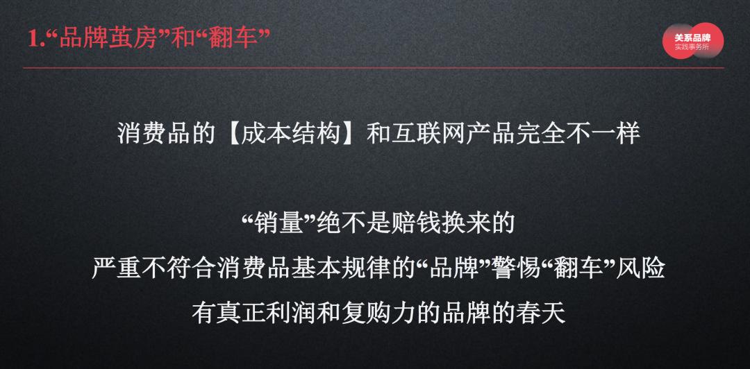 另外,消费品的成本结构和互联网产品完全不一样,“销量”绝对不是赔钱换来的,不符合消费品基本规律的“品牌”要警惕“翻车”的风险,而有真正利润和复购力的品牌会马上迎来春天。