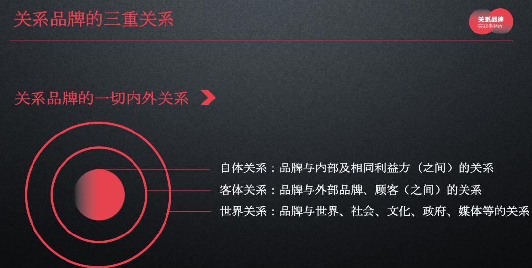 这种动态的关系中,又分为自体关系、客体关系和世界关系,而处理好品牌的这些内外关系,才能建立起我们品牌真正的价值和势能。