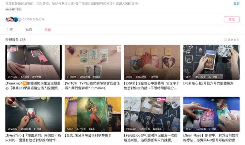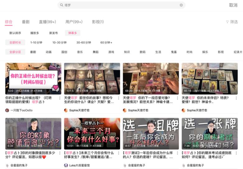 B站的首页视频推送机制,也为一些塔罗占卜的视频出现在首页提供了保证,即使是对星座、塔罗等不了解的用户也能在B站的首页上看到相关塔罗占卜的推送。