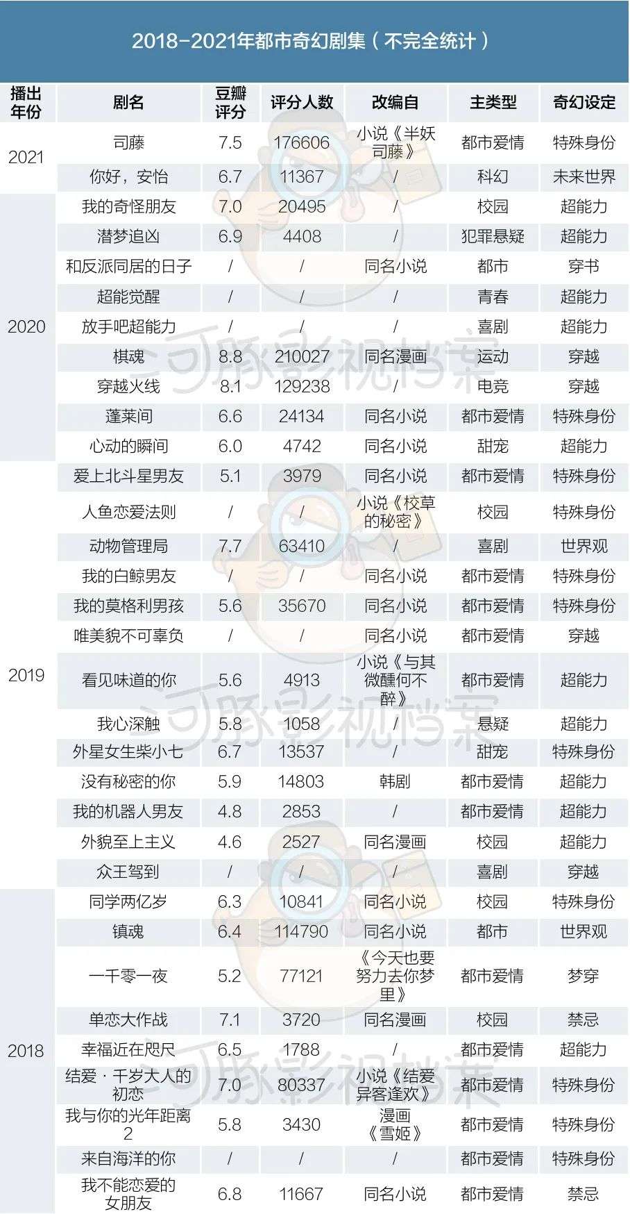 据河豚影视档案(ID:htysda)统计,自2018年至今播出的35部都市奇幻题材剧集中,19部剧集豆瓣评分低于6.0,剩余16位“过线选手”中评分最高的是8.8分的《棋魂》。15部评分人数过万的剧集均分6.38,这已经代表着都市奇幻的高水准。