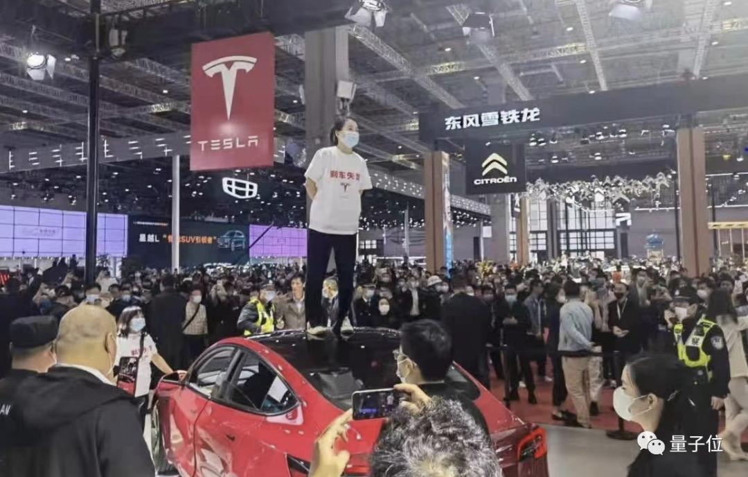 一位中国女车主,身穿“特斯拉刹车失灵”的T恤,冲上特斯拉展台,站在车顶上,引起不小风波,最后被工作人员“请”了出去: