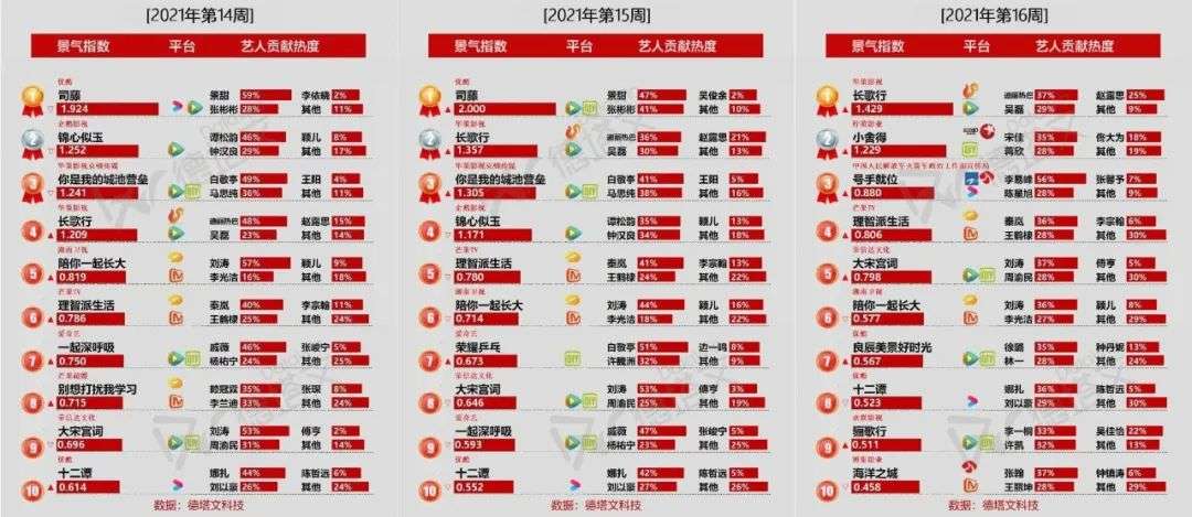 根据德塔文电视剧景气指数排行榜显示,2021年第14、15、16周《长歌行》的艺人贡献热度方面,迪丽热巴均位于首位。这从某些方面证明了迪丽热巴流量对于剧集的贡献。同时,迪丽热巴后援会发起了专项集资,爱丽丝们也开展了宣传、应援活动。比如在北京、上海地铁站投放品牌长廊广告,为期七天,配以简洁、高能的宣传语,以便让更多人、更快速地看到、了解《长歌行》。