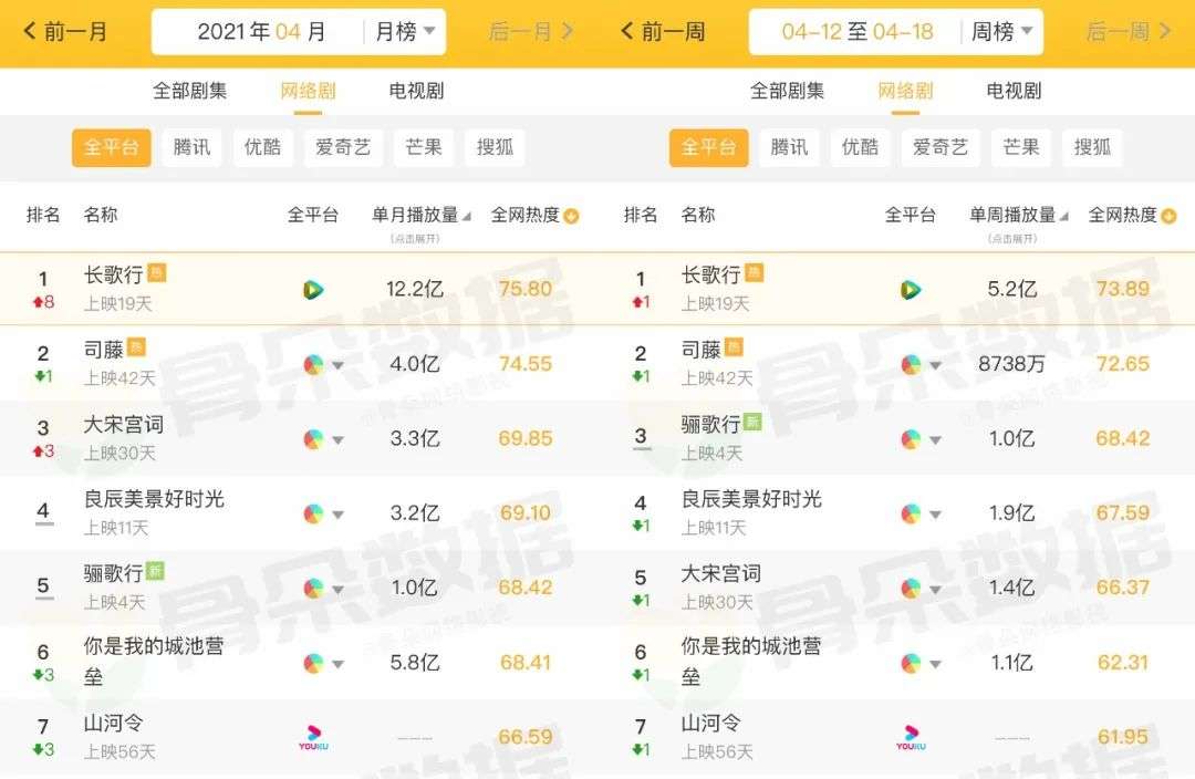 播放量上,如上文所说,在多方平台都位于前列。同时,根据骨朵数据显示,《长歌行》的热度、播放量在腾讯视频剧集中,拿下4月月榜、上线至今的周榜等多个首位。
