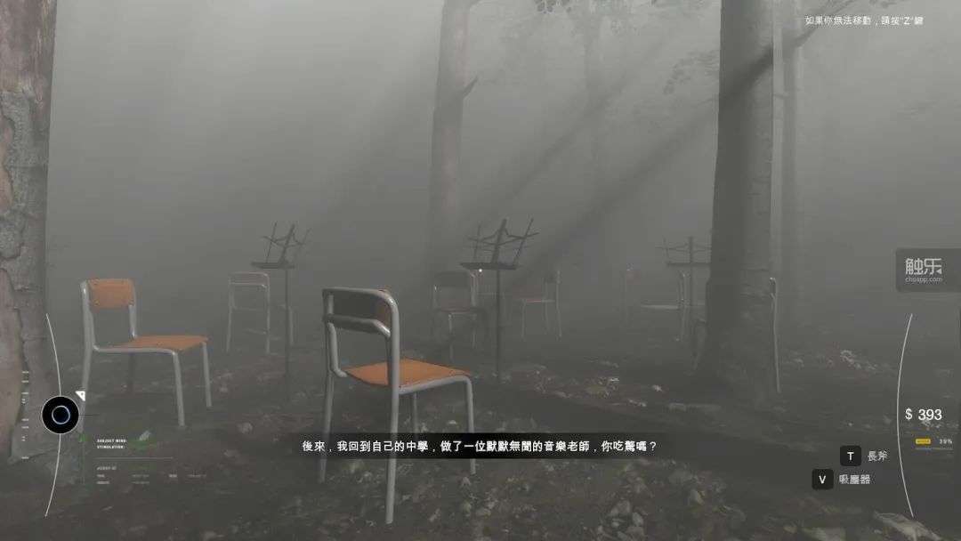 从这里开始,游戏展现出了它在氛围营造方面的独特性。演奏家的精神世界极为灰暗压抑,像是处在某种礁石遍布的海边,却看不到海水。周围枯树丛生,只有来源不明的灯光在枝条中闪烁。大脑中残存的艺术家本人的意识似乎察觉到访客的到来,提出了“一起逃离”的请求。然而,玩家并不能与他互动,只能听到他在一边自说自话,讲述着自己的故事。