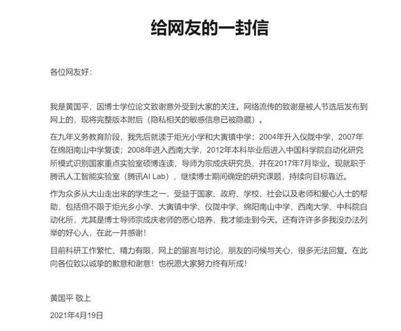 论文《致谢》大火之后,黄博士今日通过发文向网友留言和朋友关心表示了歉意和谢意。他在文中讲述了自己成长经历,称网络流传的致谢是被人节选后发布到网上的,现将完整版本附后(隐私相关的敏感信息已被隐藏)。